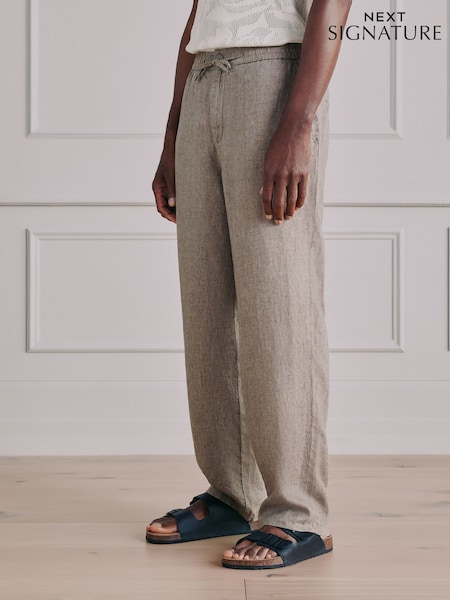 بني فاتح - Signature Linen Pleated Chino Trousers