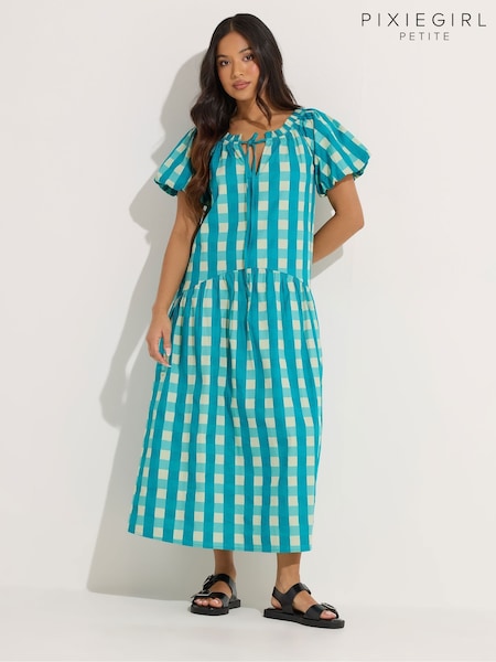فستان كاروهات مجعد بكُم طويل من PixieGirl Petite