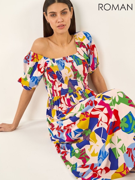 فستان متوسط الطول مُجمَّع مزين بطبعة تجريدية من Roman