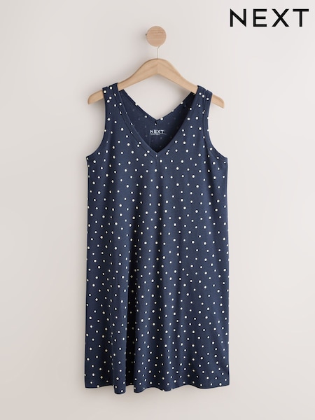 تصميم منقط أزرق كحلي/أبيض - فستان بتصميم فضفاض بلا أكمام وياقة حرف V