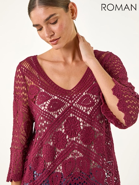 أحمر - Roman Crochet Lace V-Neck Open Knit Jumper