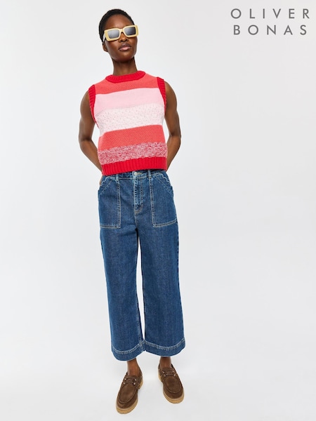 أزرق وأخضر ـ رداء عُلوي بلا أكمام محبوك بنمط مكتنز مخطّط من Oliver Bonas