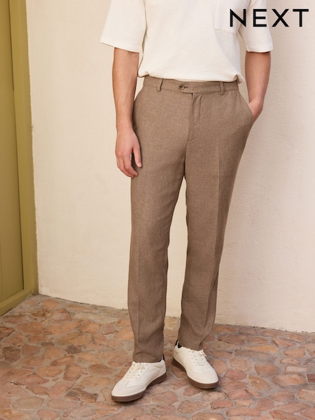 Brown Regular Tapered Fit Textured Linen Blend Smart Trousers