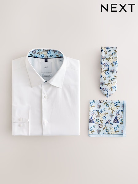 White/Light Blue Floral Slim Fit 100% Cotton Shirt, Tie and Pocket Square Kew Garden Occasion Set