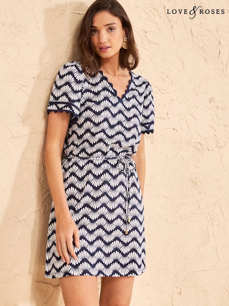 Love & Roses Navy Geo Wave Print Petite V-Neck Scallop Jersey Mini Dress