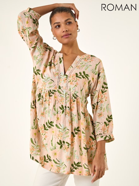 Roman Orange Lace Cuff Printed Stretch Tunic Top