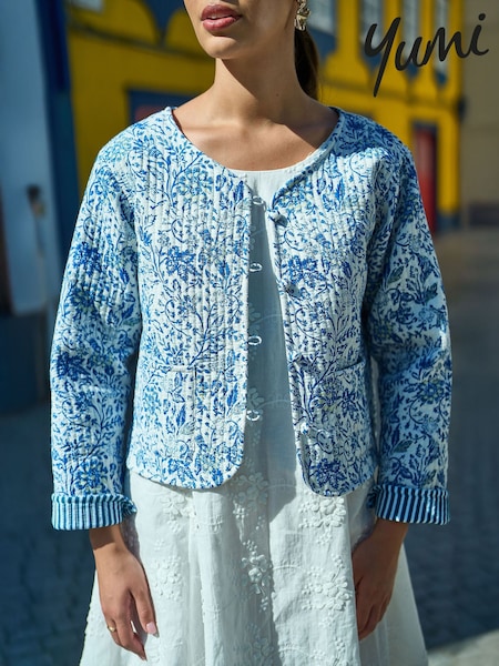 Yumi Blue Chambray Quilted 100% Cotton Jacket With Reversible Floral Print Lining